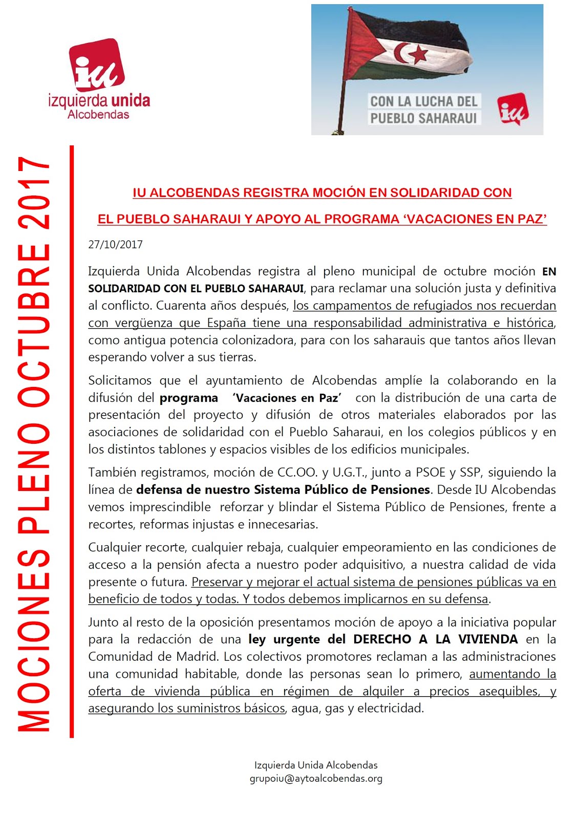 Izquierda Unida Alcobendas enmienda el presupuesto 2017 Recuperar Alcobendas para la mayoría social. Las personas y el empleo en el centro de la economía y la política. 23/Febrero/2017 Izquierda Unida Alcobendas desde la responsabilidad y el análisis exhaustivo del proyecto de presupuestos 2017, hemos trabajado en la elaboración de enmiendas, siempre bajo la premisa de revertir los recortes impuestos por el PP y Cs. Lejos de entender los presupuestos como arma especuladora de pactos, desde Izquierda Unida consideramos que son una herramienta al servicio de l@s alcobendenses , para que las políticas que necesitan se hagan realidad. No buscamos unos minutos de relevancia en los medios, sino acuerdos serios y transparentes en base a objetivos políticos comunes: REVERTIR LOS RECORTES Y DEFENDER LOS SERVICIOS PÚBLICOS, CREAR EMPLEO DE CALIDAD, LUCHAR CONTRA LA PRECARIZACIÓN Y LA POBREZA , … En definitiva, combatir la austeridad y evitar que el dinero municipal siga...
